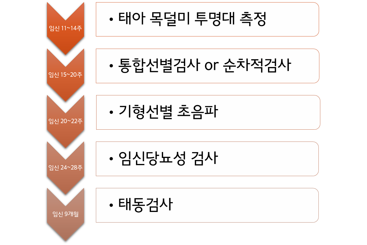 태아 목덜미 투명대 측정검사, 통합 선별검사 (또는 순차적 검사), 기형 선별 초음파 검사는 다운증후군, 신경관 이상 등 주요 태아기형의 위험을 평가하는 데 중요한 검사이다.