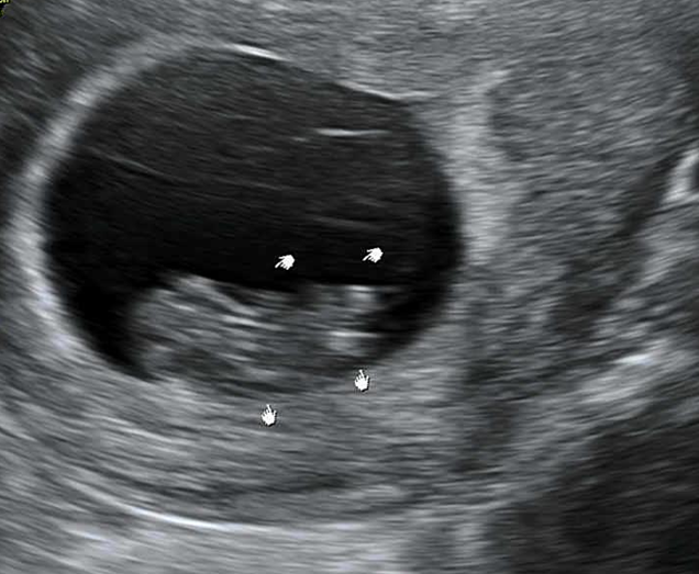 임신 10주차 태아 초음파. 왼쪽 화살표는 두 팔, 오른쪽 화살표는 두 다리